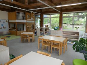 Die Gruppenräume des Kindergartens zeichnen sich durch eine breite Fensterfront an zwei Seiten aus. Außerdem besitzt jeder Gruppenraum ein Spielhaus.